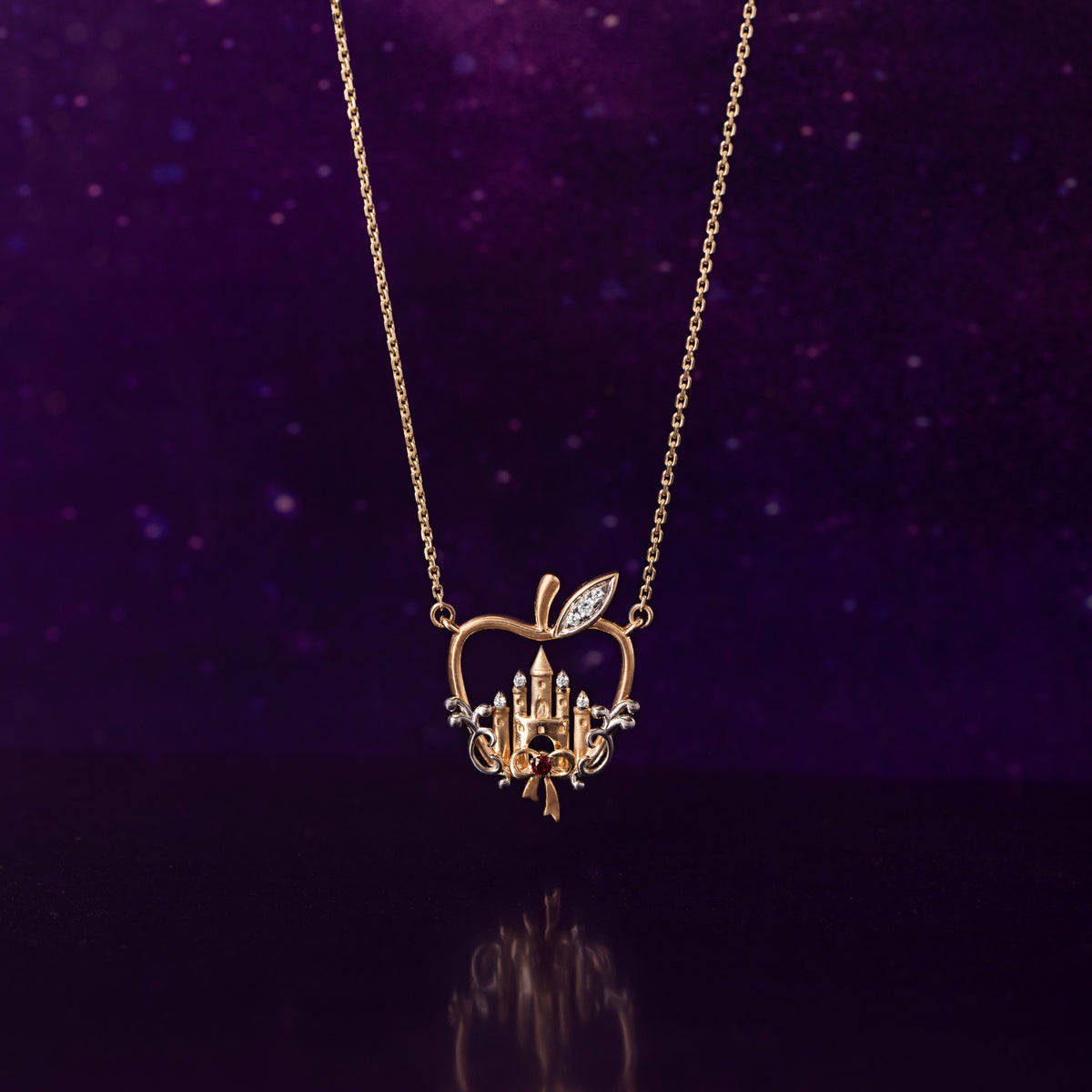 Fairy tales come to life in this intricate necklace featuring an enchanted apple and castle design. Highlighted with dainty diamonds, it’s a magical piece for Disney dreamers.