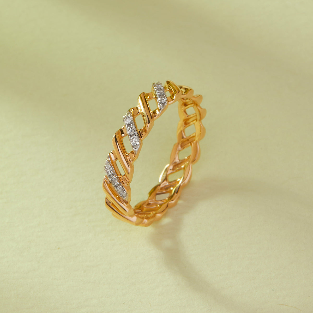 A modern band with diamonds lined along the edge, creating a bold, contemporary sparkle.